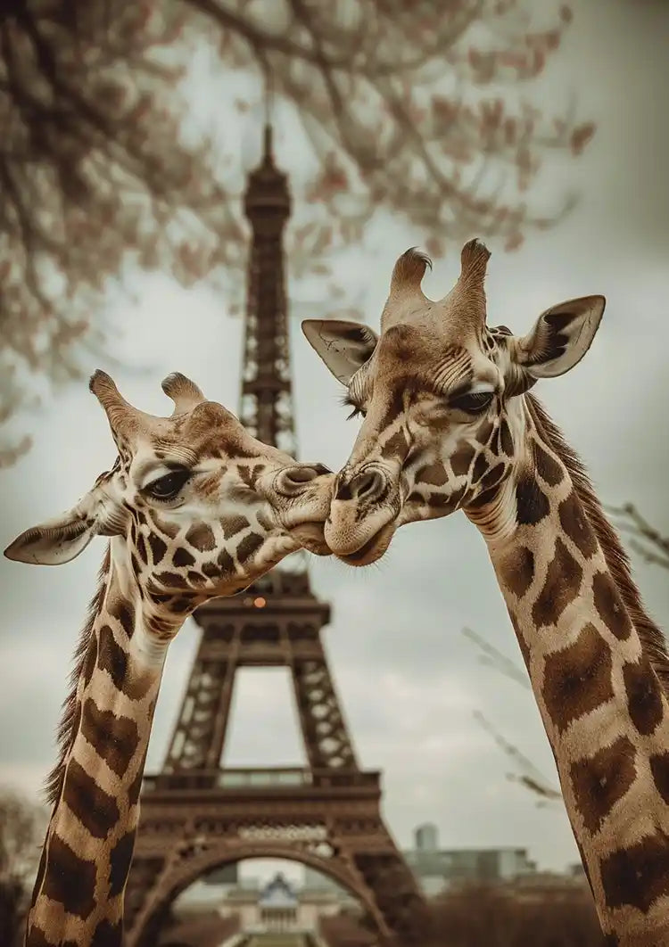 Dit schilderi toont hoe twee giraffen snuffelen tegen elkaar met de Eiffeltoren op de achtergrond. Het beeld legt een liefdevol moment vast tegen het iconische Parijse monument onder een bewolkte hemel. De lange nekken en opvallende patronen van de giraffen zijn prominent op de voorgrond.