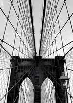 Een zwart-wit schilderij van de Brooklyn Bridge met de vele van kabels en een van de gotische torens, gezien vanaf het voetgangerspad.
