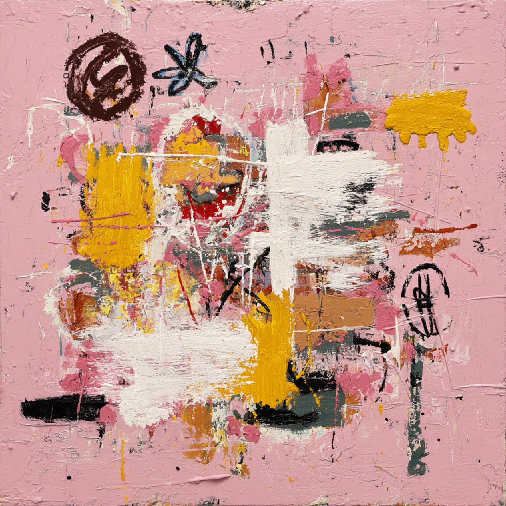 Een ruwe, textuurrijke compositie met roze achtergrond en willekeurige abstracte vormen — als een muur vol lagen geschiedenis.