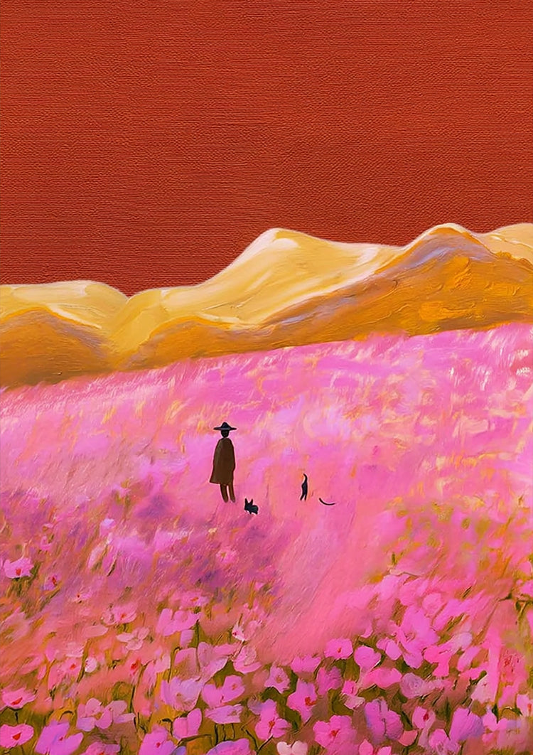 Een roze bloemenweide met een figuur en huisdieren onder een warme oranje lucht en gele heuvels.