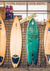 Een schilderij met verschillende kleuren surfborden tegen een muur aan.