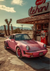 Dit schilderij toont een vintage pink Porsche geparkeerd voor een retro benzinestation met borden, omgeven door woestijnlandschap en palmbomen onder een heldere hemel.