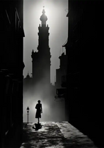 Een zwart-wit schilderij met een silhouet van een vrouw, met daarachter een vintage toren.
