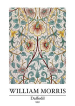 Dit schilderij, getiteld "Daffodil" en gemaakt door W. Morris, presenteert een prachtig bloemmotief met symmetrische narcissen en bladeren op een lichtgrijze achtergrond.