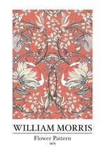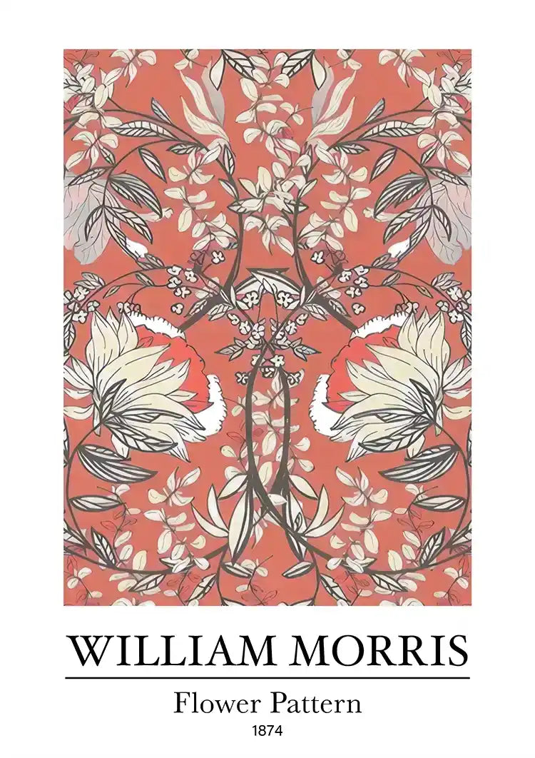 Dit schilderij, "Flower Pattern" genaamd, biedt een prachtig ontworpen bloemmotief door William Morris in 1874, met symmetrische witte, roze en groene bloemen en bladeren op een levendige rode achtergrond.