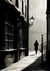 Een zwart-wit schilderij van een man met een hoed, alleen op straat.