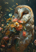 Op dit schilderij zie je een afbeelding van een uil met gesloten ogen, die een boeket kleurrijke bloemen vasthoudt. Achter hem strekt zich een groene achtergrond uit, met kleine bloemen die een serene en natuurlijke sfeer creëren.