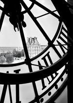 Een schilderij in het zwart-wit, met uitzicht op gebouwen door een opening door een wijzerplaat.