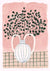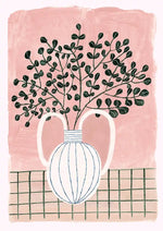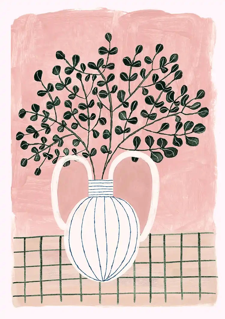 Dit schilderij toont een witte vaas met blauwe strepen, waarin een plant met veel kleine ovale blaadjes staat, tegen een roze achtergrond met een groen schaakbordpatroon.