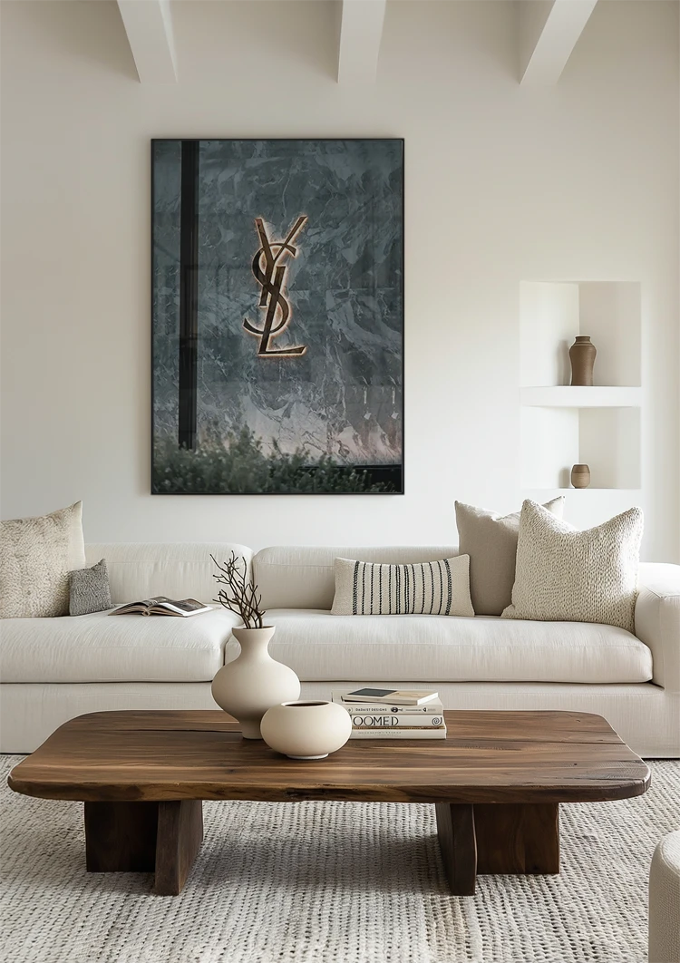 Dit schilderij kenmerkt het stijlvolle YSL-logo, gepresenteerd op een achtergrond van elegant grijs marmer, dat een gevoel van tijdloze luxe uitstraalt.