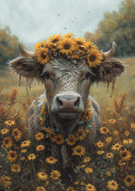 Dit schilderij toont een koe die staat in een veld tussen zonnebloemen en een zonnebloemkroon draagt. De achtergrond bestaat uit een grasveld met meer gele bloemen en bomen, waardoor een serene, natuurlijke sfeer ontstaat.